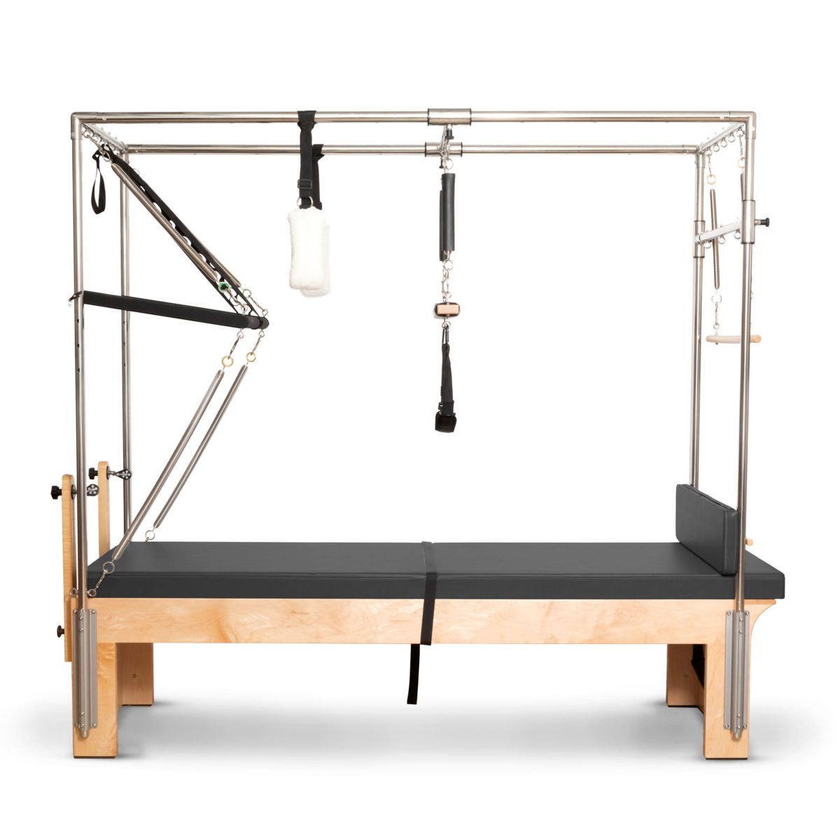 The Elina Pilates Elite Cadillac-Reformer is a professional-grade, all-in-one Pilates apparatus that combines the functionality of a reformer with a full Cadillac (Trapeze Table). It features a sturdy frame typically made of Canadian maple wood, complemented by stainless steel and anodized aluminum components for durability and smooth operation. This machine is designed to offer a comprehensive range of Pilates exercises, appealing to both home users with ample space and professional studios. It boasts innovative systems for quick changes of foot bar positions, spring bar adjustments, and pulleys, alongside an ultra-silent carriage with high-precision bearings. Many bundles also include essential accessories like a reformer box, jump board, and a full set of reformer and tower springs. Users generally praise its high quality, elegant design, versatility, and the ability to deliver a studio-level workout. However, it is a very heavy unit, lacks transport wheels, and custom upholstery can lead to long wait times. Some users have also noted that the assembly instructions could be more detailed.